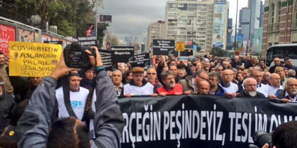 Gazeteciler “Gerçeğin peşindeyiz, teslim olmayacağız” pankartı açarak Cumhuriyet Gazetesi binasına doğru yürüyüşe geçti. Ellerinde “Zindanlar boşalsın, gazetecilere özgürlük”, “İyi çocuk değiliz, krala çıplak deriz”, “İnadına daha fazla gazetecilik” yazılı dövizler taşıyan grup, yol boyunca “Özgür basın susturulamaz”, “Durma haykır, özgür basın haktır”, “Can ve Gül çıkacak, yine yazacak” şeklinde sloganlar attı.
