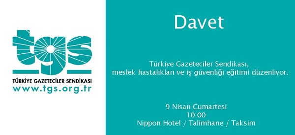 Türkiye Gazeteciler Sendikası  olarak 9 Nisan 2016 Cumartesi günü Taksim/ Talimhane’de bulunan Nippon Hotel’de “Meslek Hastalıkları ve İş Güvenliği Eğitimi” düzenliyor. Düzenlenecek eğitime tüm gazeteciler…